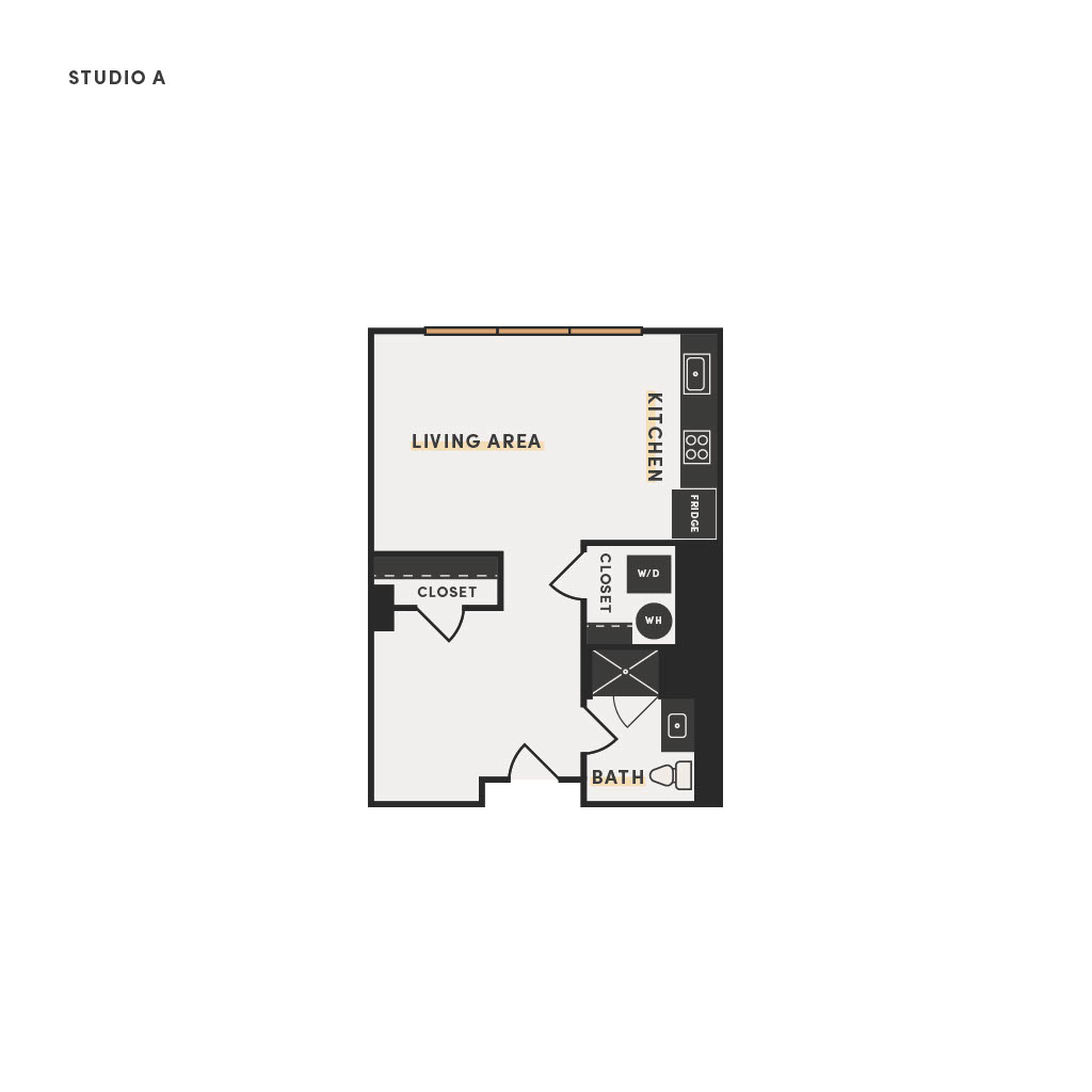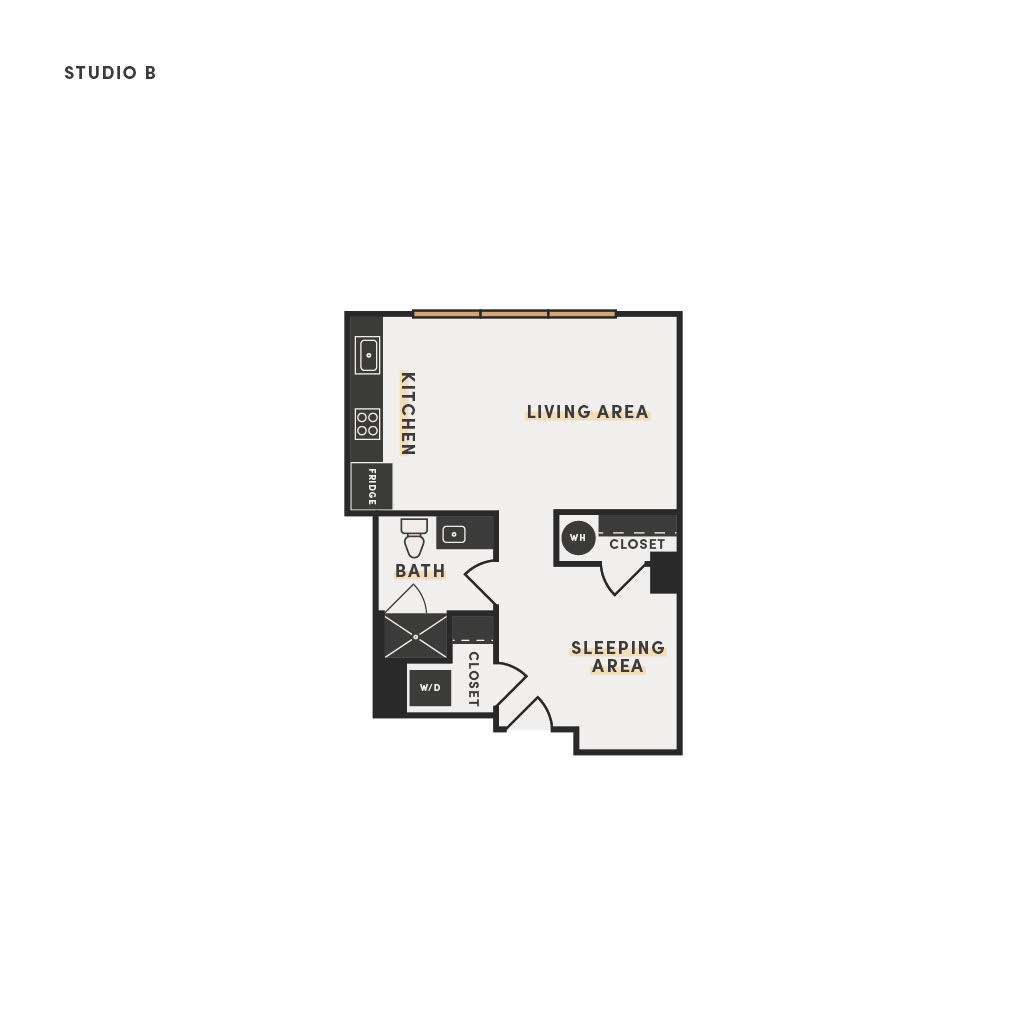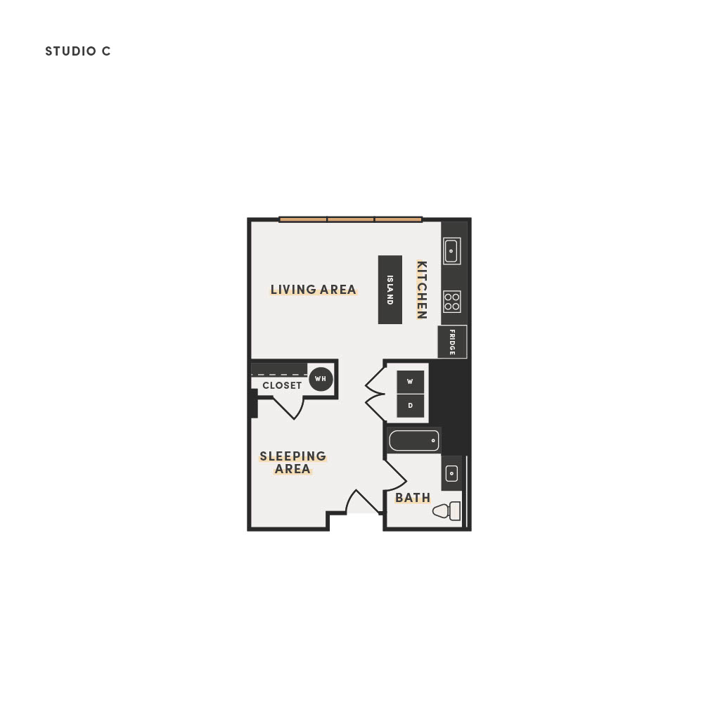 Rendering of the Studio D floor plan with a Studio bedroom and 1 bathroom[s] at The Victor